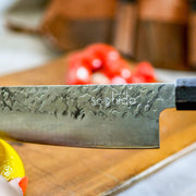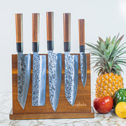 Treat yourself to this high-quality Soshida Japanese Carbon Steel Chef Knife Set & Cowhide Leather Chef Knife Bag. This luxury knife set boasts it's beauty with a hand forged hammer design and ergonomic bubinga wood handles. The combination of hardness and softness, with the spirit of ingenuity, makes each knife a work of art, and the organic combination of practicality and beauty. The knives are of high grade and durable. Each blade endures 480 minutes of casting and forging to manufacture. For Home or Restaurant use for the cutting of vegetables, fruit, meat, fish, and poultry.