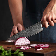 Elevate your culinary experience with the Soshida Zen 8” Damascus Steel Chef Knife, meticulously crafted to meet the demands of both professional chefs and home cooking enthusiasts. This 8-inch chef's knife combines traditional craftsmanship with modern materials to deliver exceptional performance.